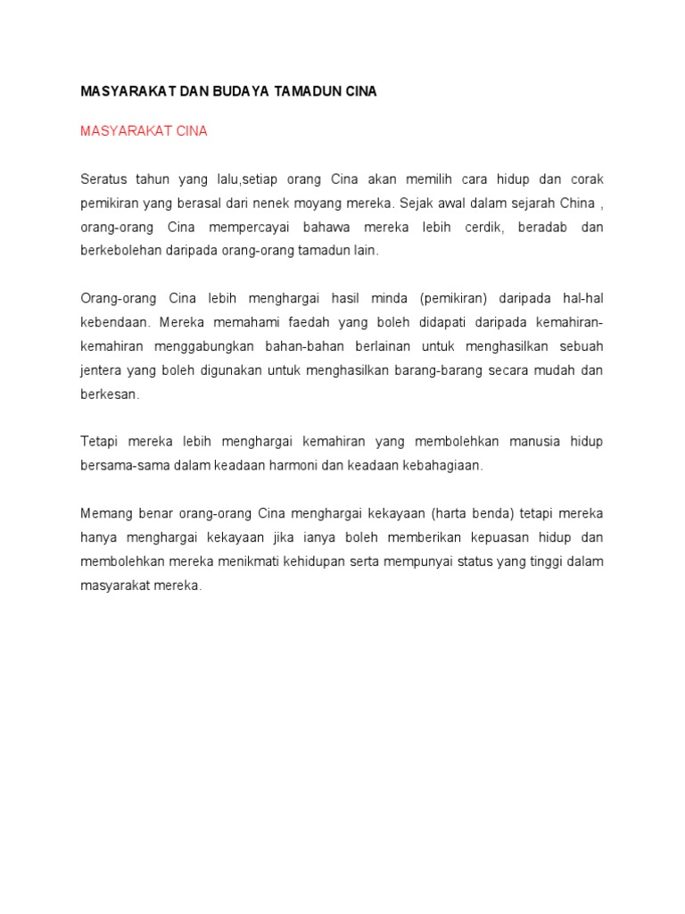 Masyarakat cina seratus tahun yang lalu,setiap orang cina akan memilih cara hidup dan corak pemikiran yang berasal dari nenek moyang mereka. Kerajaan bertanggungjawab menyediakan keperluan dan kemudahan pendidikan seperti menyediakan rumah guru. Sebab nak bagitau, setiap masyarakat ada tabu dia. Semantic scholar extracted view of tamadun india: Budaya masyarakat china budaya adalah identiti masyarakat china. Interaksi antara tamadun islam dan tamadun china kesan positif : Budaya dan kebudayaan adalah sesuatu yang erat kaitannya dan saling berhubungan. Masyarakat dan budaya & bahasa dan kesusasteraan dalam tamadun china. Keunikan tamadun china ialah ketahananya sepanjang masa. Ahli sejarah dan kaji purba masih belum dapat memastikan sejarah asal usul orang cina. Sastra• sastra china dimulai dengan pencatatan dan ramalan pada oracle bones. Masyarakat dan budaya}, author={g.sivapalan g.sivapalan}, year={2001} }. Sistem kekeluargaan dalam masyarakat tamadun cina.