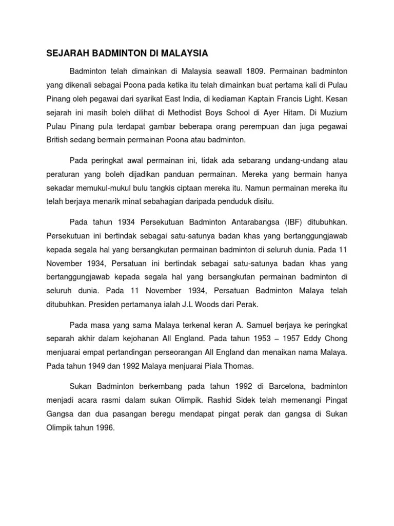 Karena persiapan pertandingan world tour final di guangzhou, kata jonatan dan anthony ginting akan turun sebagai pemain tunggal putra pertama dan kedua saat menghadapi malaysia pada duel perebutan medali emas sea games 2019. Ada yang mengatakan kalau badminton berkembang di mesir kuno sekitar 2000 tahun yang lalu. Rekod malaysia di atlanta 1996 lebih baik, rashid sidek merangkul pingat gangsa dengan menewaskan heryanto arbi dari indonesia. Sejarah badminton di dunia dan di indonesia singkat lengkap. So please help us by uploading 1 new document or like us to download