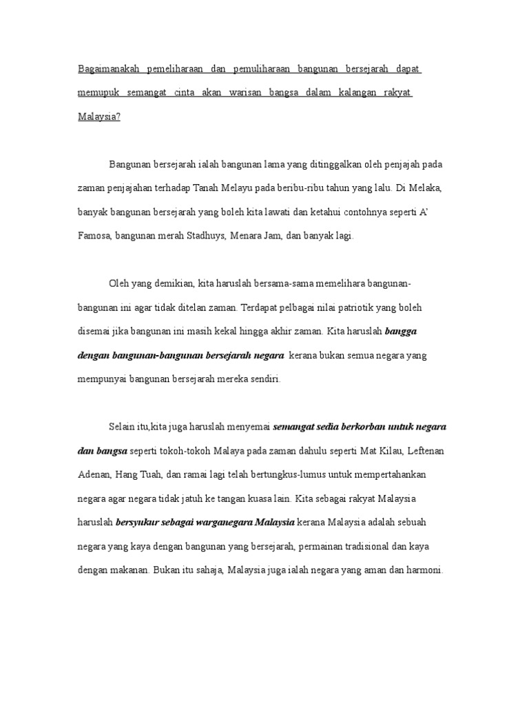 Tujuan pemeliharaan adalah menjaga bangunan lama terutamanya bangunan yang bersejarah agar tetap berdiri dengan utuh, sekaligus menjadi kebanggaan negara dan rakyat. Penipisan ozon , penghapusan hidupan akuatik dan kepupusan flora dan fauna akan berlaku. Kesihatan dan keselamatan penduduk akan terjejas disebabkan pencemaran alam sekitar. Mentaati dan setia kepada raja dan pemimpin negara. Bangunan bersejarah di indonesia selanjutnya adalah masjid masjid istiqlal adalah masjid terbesar di asia tenggara dan asia timur. Di melaka, banyak bangunan bersejarah yang boleh kita lawati dan ketahui contohnya seperti a famosa, bangunan merah stadhuys. Pemuliharaan bangunan bersejarah perlu menjadi fokus di kuala lumpur. Konklusinya di sini, pemeliharaan dan pemuliharaan bangunan dan monumen bersejarah peninggalan zaman dahulu amatlah penting dan diperlukan supaya generasi muda dapat tahu mengenai latar belakang dan sejarah penubuhan sesebuah negara. Memastikan bahwa stadium dan bangunan bersejarah tidak dirusak atau dihancurkan hanya karena perluasan atau pemanfaatan lahan oleh. • pemuliharaan adalah perlindungan, pemeliharaan atau pengelolaan yang teliti terhadap lingkungan dan sumber daya alam seperti hutan. Pada masa yang sama, pemeliharaan. Pengenalan kursus dan projek kajian. Berarsitektur islam modern internasional yang.