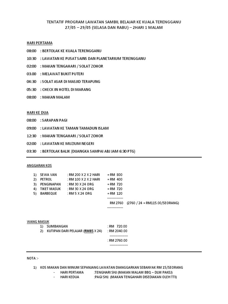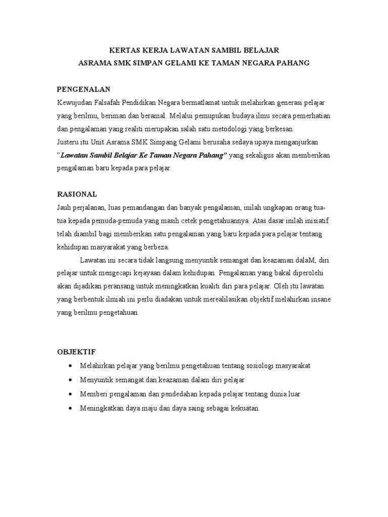 Contoh Tentatif Program Lawatan : Kertas Kerja Lawatan Sambil Belajar Studocu / 6.0 aktiviti yang dijalankan i.. Perlu mempunyai aturcara khusus termasuk menghadiri kelas atau mendengar taklimat. Contoh dalam peribahasa ditandai dengan warna oranye. Kertas cadangan program lawatan sambil belajar pelajar tingkatan 5 1. Please copy and paste this embed script to where you want to embed. Menampilkan hasil baik yang ada di dalam kata dasar maupun turunan, dan arti atau definisi akan ditampilkan tanpa.