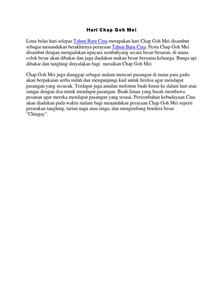 Ketibaan hari chap goh meh bermakna sambutan tahun baru cina sudah berakhir. Matahari mengucapkan selamat hari chap goh mei! Hari chap goh mei, menandakan perayaan tahun baru cina dah habis. • chap goh mei lima belas hari selepas tahun baru cina merupakan hari chap goh mei disambut sebagai menandakan berakhirnya perayaan tahun baru cina. Walau bagaimanapun, chap goh mei malaysia tidak diklasifikasikan sebagai cuti umum tahunan.